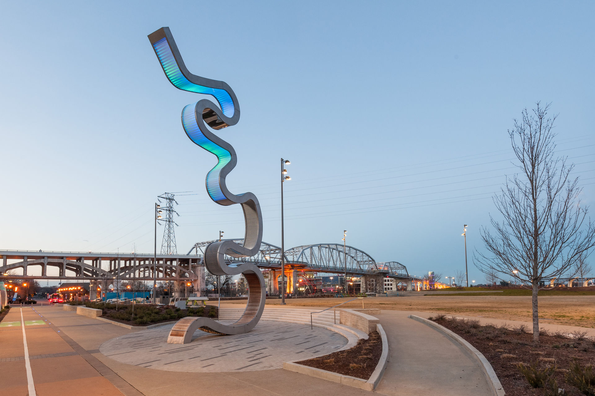 Conceptually, the artwork draws on the city’s relationship to the river, symbolically reuniting the city’s past and present as well as the natural and urban environment of downtown. The form of the sculpture is based on the meandering curves of the Cumberland River as it passes through Davidson County.