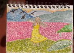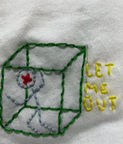 Global Education Center youth created artworks in response to prompts. Left: a drawing representing a student's favorite song (by Abby, student). Right: needlework representing quarantine (by Manar, student).